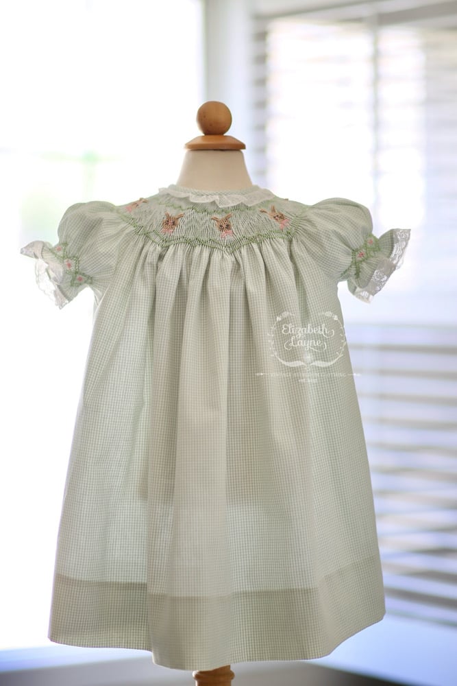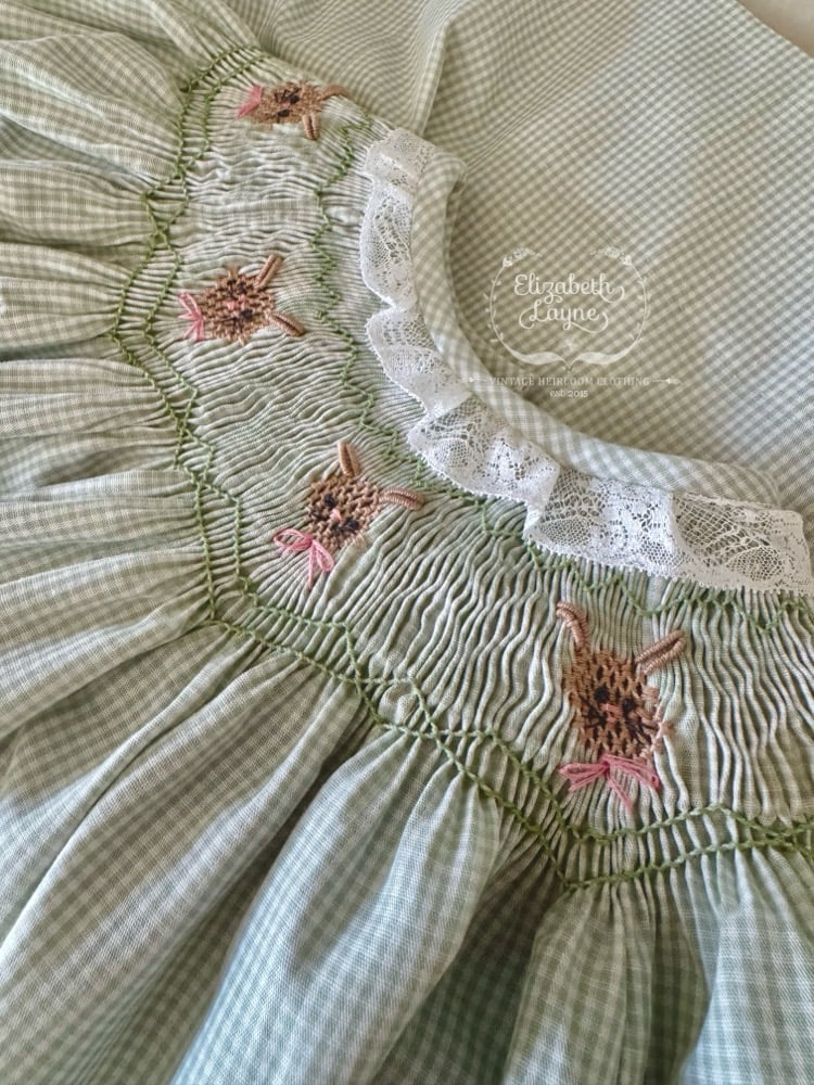 • Hand smocking features a delicate geometric design with the cutest bunny’s - we love those sweet bullion stitch ears