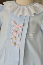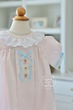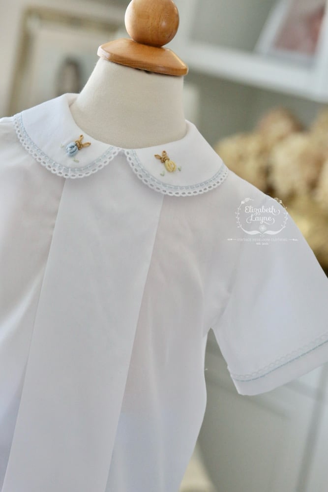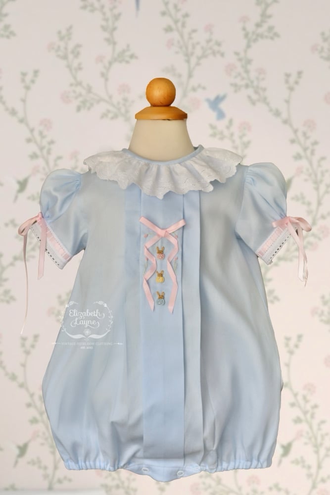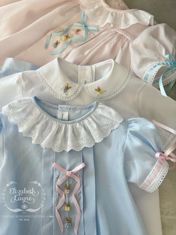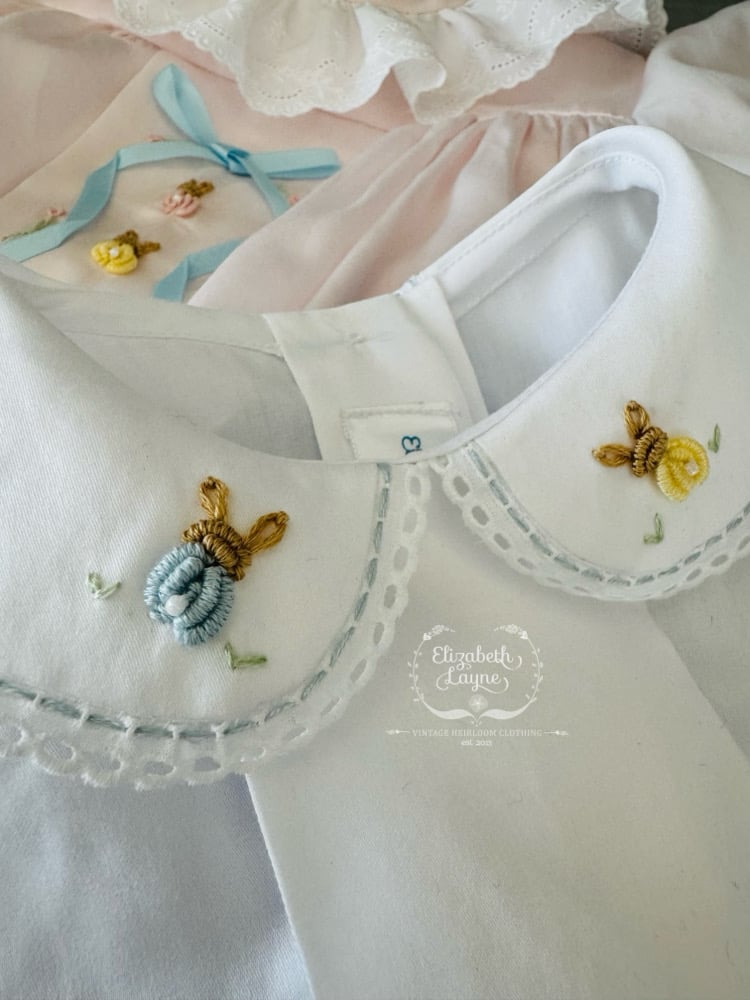Let’s walk down Bunny Cane Lane and dress our little one’s in timeless silhouettes that have the tiniest, sweetest hand embroidered bunnies and tulips sprinkled around a sweet satin ribbon that is hand embroidered on!