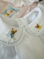 • Tiny bunnies and florals hand embroidered for the most delicate touch