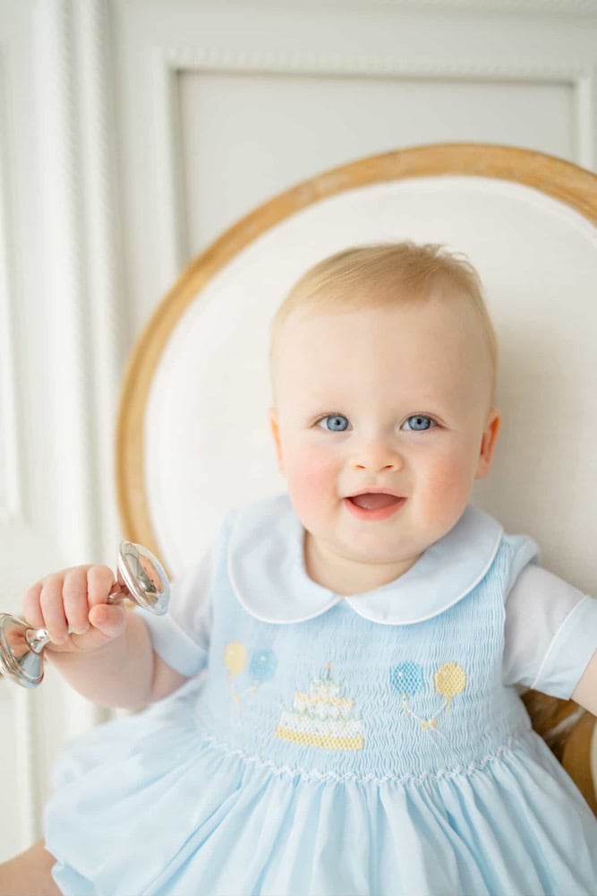 • Hand smocking: The core of the design and what makes this beautiful look stand out. Festive party details include balloons and birthday cake, all detailed with lots of hand embroidered bullion stitches and hand finishing touches. (Or customize and choose to have a party hat on one side of cake like short set in photos.)